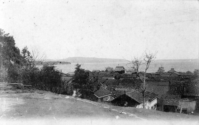 愛宕山の少年科学館跡地付近から松本町・富岡町方面を撮影した写真です。海際に見えるお堂のような建物は西宮神社拝殿だと思われます。高解像度で見るとよく分かるのですが、屋根に石を載せた屋根があちこちに見えます。