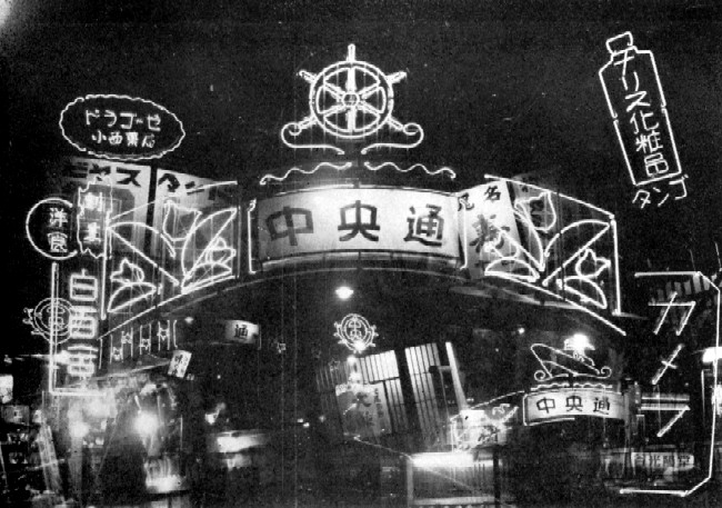 昭和26年(1951年)ころの中央通りのネオンサインです。当時はまだネオンサインが目新しかった時代だそうで、夜、七尾の町を歩く市民の目をひときわ引いたことでしょう。