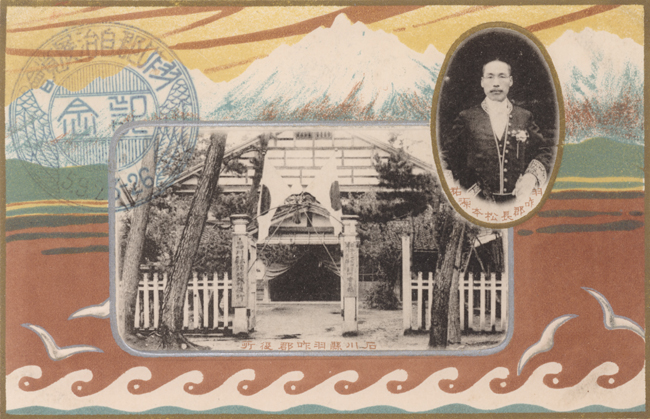 大正5年(1916年)の消印のある羽咋郡役所と郡長松本源祐氏。あずまの農家の建物を利用していた庁舎です。
