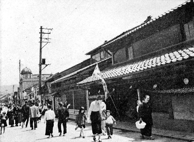 昭和29年(1954年)ころの一本杉通りです。先ごろ登録有形文化財に登録された高澤ろうそく店の土蔵造りのお店が見えます。奥のほうに見えるドーム状の屋根をした建物は北陸銀行七尾支店で今のメルコの場所にありました。和洋の建築がまざり合った魅力的な町並みです。