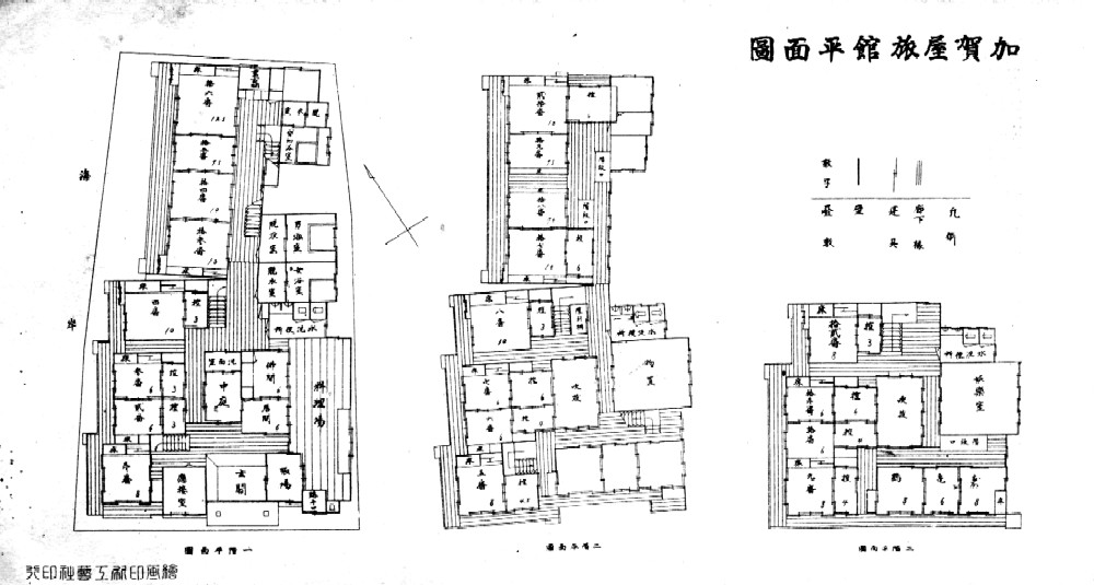 戦前の加賀屋のパンフレット掲載の館内平面図です。これを見ると当時の和倉温泉の旅館の間取りが分かります。玄関右手に帳場、正面に中庭に面した居間、仏間があり、また客室の両側に廊下が配置されています。パンフレットの案内によると「お部屋は控間付き和風建築で極静かな落ち付いた御宿泊が願へる様しつらへて居ります。」とのこと。