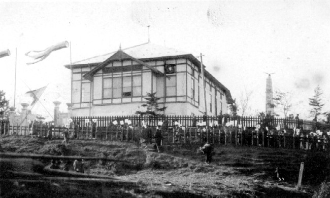 小丸山公園内の愛宕山にあった鹿島郡公会堂です。私が中学生に入るころだったかに壊されてしまった少年科学館の前身です。ホルマリン漬けの動物の内臓とか展示されていて怖い怖いと言いながら喜んで見てたのを覚えてます。公会堂は明治28年の大火で焼失しましたが、明治42年の皇太子(後の大正天皇)行啓の休憩所として二万八千円あまりかけて再建されました。写真をよく見ると日の丸の旗を持った人が大勢いるのが分かります。これは、おそらく大正5年に皇太子(後の昭和天皇)が行啓した時の写真ではないかと思います。背後に見えるのは確か現存していると思うのですが、日露戦争戦没者を祀った忠魂碑で明治42年に完成しています。皇太子行啓といい、忠魂碑といい、帝国時代の愛宕山は国威掲揚の場所だったのでしょう。
