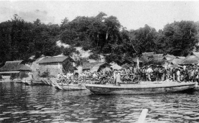 大正15年(1926年)8月に行われた歩兵第七連隊集成大隊による能登一週行軍。現能登町越坂での乗船の様子。