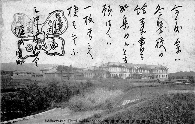 明治40年(1907年)1月13日の消印のある石川県立第三中学校の絵葉書です。この年5月に校名を石川県立七尾中学校に改まりました。