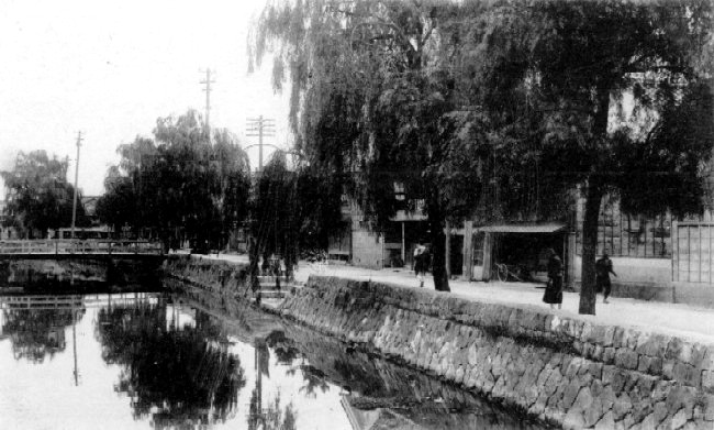 戦前の川渕通りと泰平橋が写っている写真です。川渕通りは明治の大火の後に火事の延焼防ぐためにと、つくられた道だそうです。江戸時代は一部川に面した道がありましたが、海まで続く通りではありませんでした。うっそうと茂っている柳並木が印象的な写真です。