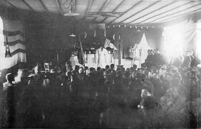 明治末年(1912年)、七尾中学校で行われた皇太神宮例祭。日露戦争から7年後で、軍国主義教育が盛んになっていった時期です。天皇家の先祖神を祀る神道儀式が学校行事として行われていたようです。所口町の気多神宮の宮司が斎主となっています。この写真を掲載しているのは『之餘会報』という冊子で、之餘会という七尾中学校校友会が発行していました。この号の中心記事は陸軍と海軍の将校による日露戦争講話でした。
