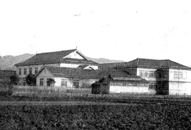 明治41年(1908年)の創立で七尾尋常高等小学校(七尾男児小学校)から分立しました。大正4年(1915年)に字藤橋に男児校の新校舎が建設されるまでのあいだ男児校は女児校に間借りしていたそうです。所在地は現在七尾市役所の庁舎が建っているあたりで、市役所の裏、相生町の幅の広い道はこの女児小学校の正門に続く道だったようです。写真を見て分かるように周囲はすべてまだ田園地帯でした。昭和15年(1940年)に男女共学の袖が江尋常高等小学校、翌年には袖が江国民学校となり、戦後になって七尾市立袖が江小学校、山王小学校袖が江教場を経て、昭和43年(1968年)に矢田郷教場と統合され、山王町へ移転し七尾市立山王小学校となりました。旧校舎は橘町から移転してきた七尾市役所の庁舎として使用されました。古い木造の庁舎が懐かしいです。