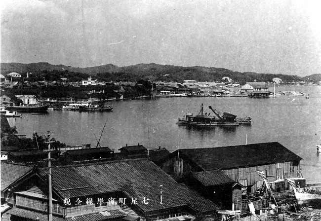 昭和14年の府中町海岸に立ち並ぶ建筵(むしろ)の倉庫群と港が写っています。「七尾町海岸線全貌」という題名がついている絵葉書です。第二種重要港指定を受けた七尾港の整備は、港の姿を全く変えるような大規模な工事を何期にも渡って施行し行われました。この写真の当時は、倉庫群の前の海を埋め立てて船溜を造る計画が進行中でした。手前の造船所は埋め立てが進むにつれて矢田新、三島町などに移転したそうです。江戸時代の海岸線は現在のものより、ずっと内陸側にあり、小島の妙観院や常盤町のあたりは浜であったそうです。今では想像もつきませんが海水浴ができたという話もよく聞きます。今思うに、たび重なる埋め立て、特にこの写真の当時の軍事目的による埋め立てによって七尾が失った景観には大きなものがあったのではないでしょうか。