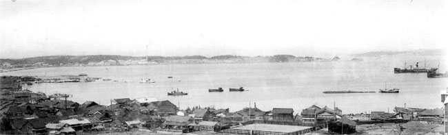 | 昭和7年ころに七尾町役場から発行された「七尾港」という2枚セットの絵葉書のうちの1枚で、「七尾の市街と港内の一部」と題がついているものです。昭和2年(1927)年に七尾港が第二種重要港湾に指定され、この写真の当時は、大規模な七尾港修築工事の真っ只中でした。 上部分は矢田町方面から撮影した七尾町の市街地で、手前はちょうど七尾町の東のはずれ、郡町付近になります。霊泉寺や、その脇のかつて御坊町と呼ばれた通りの4か寺の屋根が見えます。下部分は、まだ埋立が進んでいない港湾部の写真です。海岸線に倉庫や造船所らしき建物が並んでいるのが見えます。左側はまだ空き地が目立ち、現在のどのあたりなのか見当がつきません。 もっと大きい画像が見たい人は→ 其の一拡大画像 其の二拡大画像 (別画面で開きます。) |