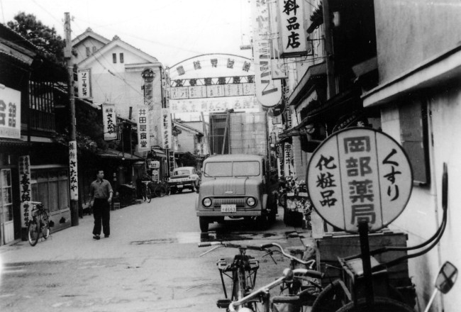 昭和30年代の大手町通りの写真です。一枚目より10mほど駅の方角へ下がって撮影したものです。古い型のトラックや看板が見えます。なにかと昔のものが好きな私としてはこういう風景が恋しいです。岡部薬局、さたみやなどいろいろな看板が見えます。中でも栂本表具店の表具師と書かれた看板が江戸時代ぽくていいですね。