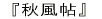 『秋風帖』とは、頼山陽・篠崎小竹・小石元瑞・後藤松陰・浦上春琴・田能村竹田といった19世紀前半の代表的な京阪文化人たちが五代目塩屋清五郎こと岩城西陀のために漢詩や絵を寄せ書きした画帖である。 江戸時代の七尾町人が遺した最大の遺産ともいえる『秋風帖』であるが、残念ながら現在所在が不明となっている。中村禎雄氏の著作によると、以前はわかもとの社長が所蔵していたそうである。 『秋風帖』は、書画骨董愛好家の間で相当有名な存在であったようで、確認できているだけでも二度影印本が出版されている。明治時代に景竹会から(石川県立図書館所蔵)、昭和6年ごろ(1931年ころ)には京都の便利堂より出版されている。七尾古写真アーカイブでは、便利堂より発行された影印本を所蔵している。ウェブサイトでの公開について便利堂へ問い合わせたところ快諾をいただいた。よって、『秋風帖』の一部をここで公開させていただくことにする。ここでの公開を通して、七尾市民の間で『秋風帖』が認知されていくことを期待する。そして、いつの日か影印本を再版し、七尾市民の間に広く普及せしめることを願うものである。ゆくゆくは『秋風帖』の実物を七尾へ里帰らせたいとも夢見ている。『秋風帖』の所在をご存知の方がおられたら七尾古写真アーカイブまでご連絡いただきたい。 『秋風帖』影印本を出版し、さらに今回の公開に理解を示していただいた便利堂に深く感謝の意を表します。