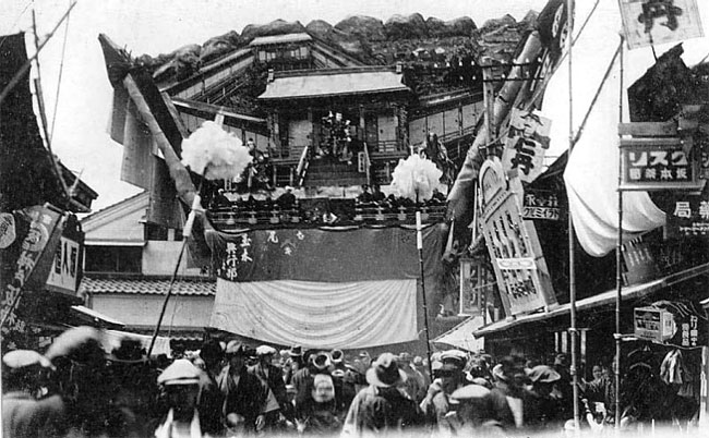 魚町のでか山です。この年は「絵本大功記本能寺」の場面とあります。おそらく明智光秀、織田信長、森蘭丸などの人形の姿があるのではないでしょうか。これらの人形は祭りの前日に市内の民家で「人形見」と称して展示されます。この写真から当時の町屋と比べていかにでか山が大きかったかが分かるはずです。かつては鹿島町からでもでか山が動いている姿が確認できたと聞きます。看板の字から塗師町の違堀坂本薬局のあたりと分かります。レトロな看板が時代を感じさせます。この祭は正式には青柏祭といい山王さんのお祭で、国の重要無形民俗文化財に指定されています。でか山に関しては郷土史の研究に尽くされた松浦五郎氏編著の『七尾の「でか山」』(七尾市職員労働組合発行)にとても詳しく書かれていますのでぜひ一度お読みになってみてください。