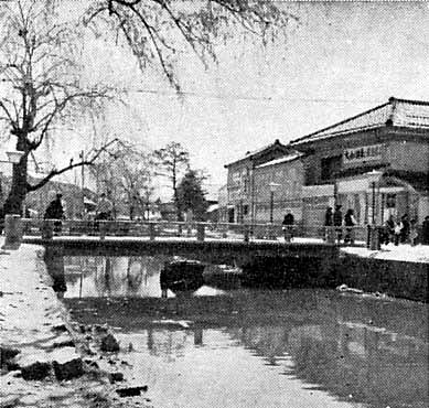昭和29年(1954年)ころの泰平橋界隈。右手に見える建物は現在の寄合い処 御祓館(いしり亭)。写真の当時は大和證券の事務所として使われていました。もともとは十二銀行七尾支店でしす。また、現在の泰平橋は灯りの橋として、燭台が取り付けることができるようになっています。
