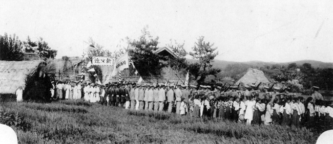 大正15年(1926年)8月に行われた歩兵第七連隊集成大隊による能登一週行軍の様子。旧富来町福浦村民による歓迎の様子。